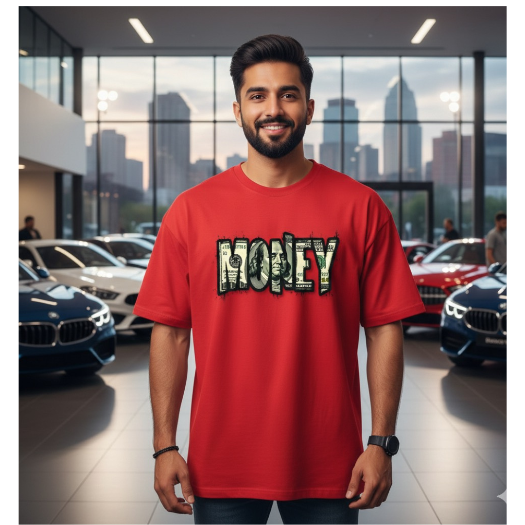 Turn heads and make a statement with the Money Talks Oversized Graphic Tee.  this T-shirt features an eye-catching "MONEY" text graphic filled with intricate dollar bill artwork—each letter amplifies your drive for success and ambition. Made from soft, high-quality fabric, it ensures maximum comfort while delivering standout streetwear appeal. Perfect for hustlers, trendsetters, and anyone who believes that ambition deserves to be seen, this tee seamlessly pairs with your favorite jeans or joggers for an effortlessly cool look. Wear your hustle—let your outfit speak volumes about your journey to the top.