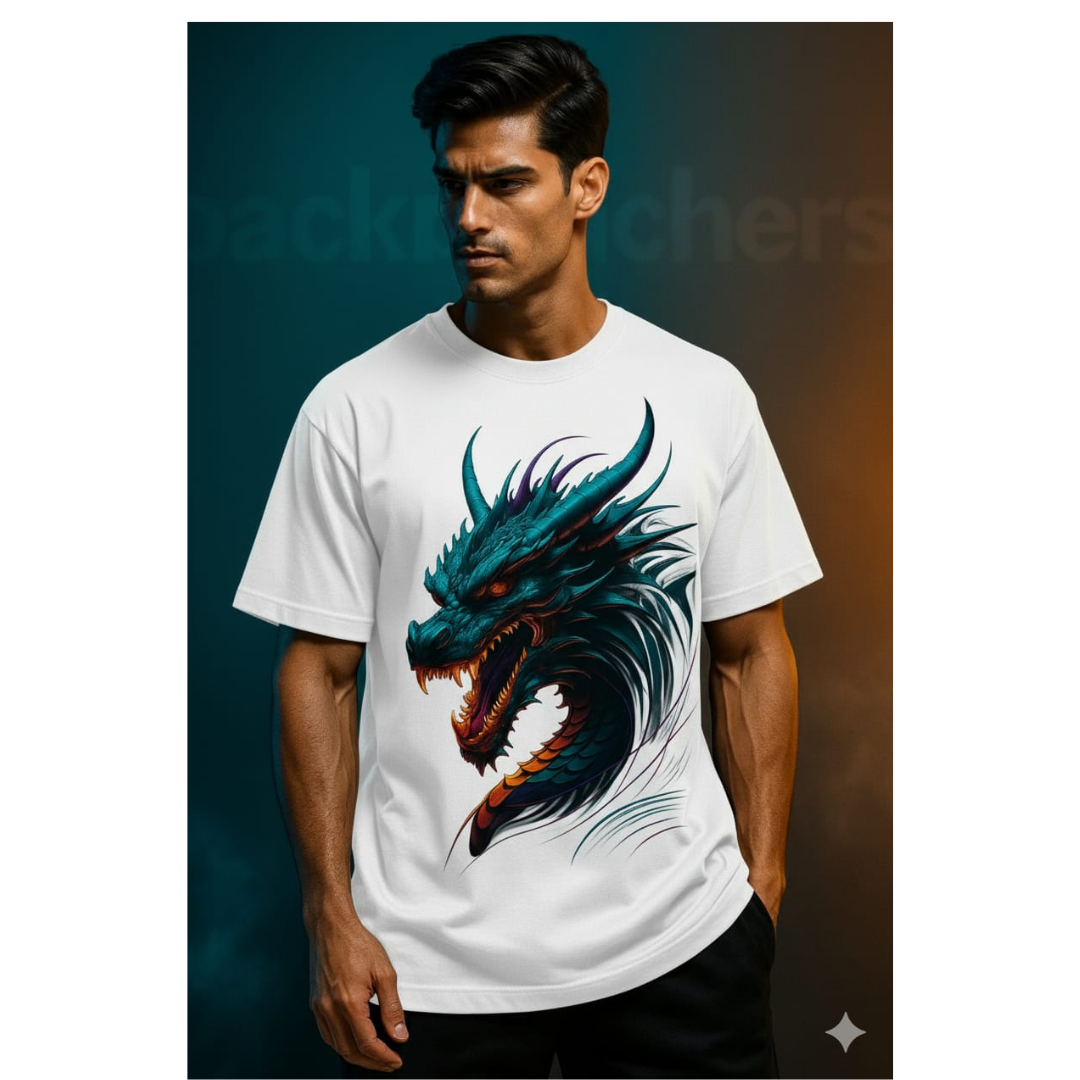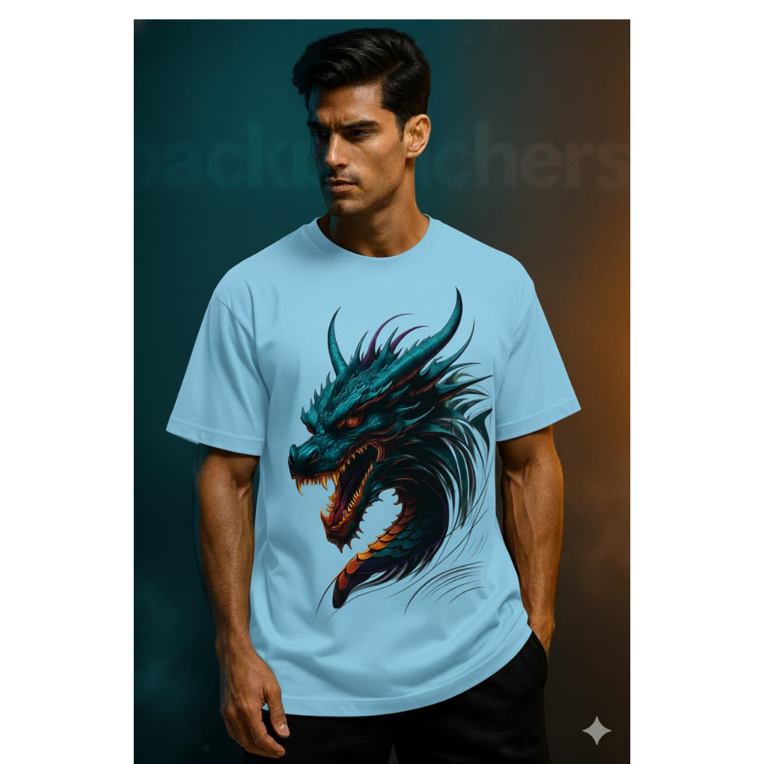 Showcase your fierce and unique style with the "Azure Fury" t-shirt, featuring a detailed dragon head bursting with energy and movement. The bold illustration combines sharp horns, vivid blue and teal scales, and a captivating snarl, signifying mystic strength and fearless attitude. Ideal for anyone drawn to fantasy art and powerful creatures, this tee brings a legendary vibe to your everyday look.
